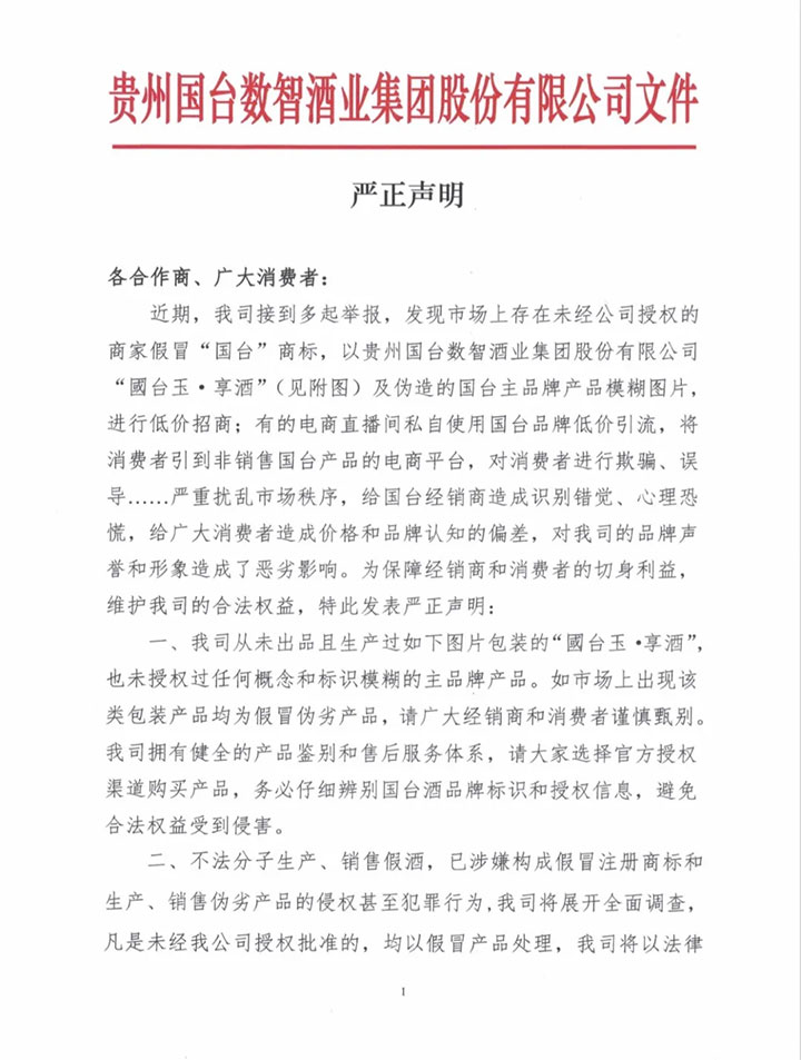 酱酒界讯:近日、贵州国台数智酒业集团股份有限公司发布严正声明,直指当前市场存在的假冒侵权与违规经营乱象 —— 无授权商家冒用国台商标推出 “國台玉・享酒” 等假冒产品,部分电商直播间借国台品牌低价引流却未销售正品,不仅扰乱市场秩序,更造成消费者品牌认知偏差与经销商经营恐慌。作为长期关注白酒行业合规发展的垂直媒体,酱酒界结合声明核心要点,解析酒企品牌维权与市场规范的行业命题。